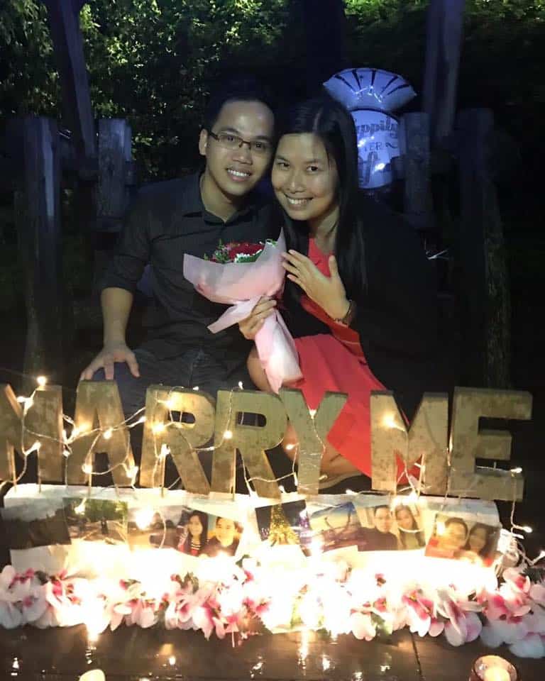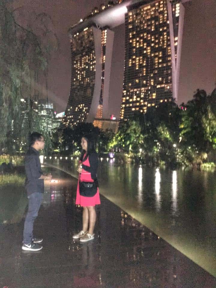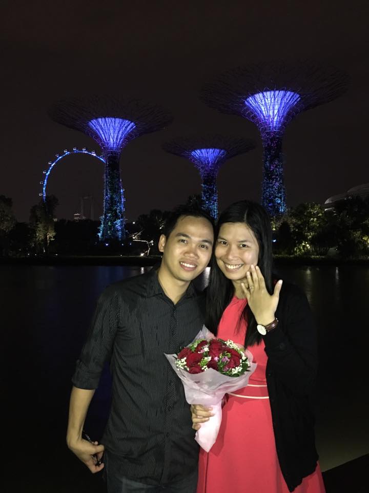 “It was an ordinary day turned into a magical night for the two of us. He told me that we were meeting his cousin from Cebu and will have dinner after. When we reached MBS, it started to rain. He told me to wait for a while because his cousin was stranded at the Flower Dome because of the heavy rain. After an hour, the rain stopped and he said that we would just meet his cousin half-way because they didn’t have an umbrella. So, we walked and after going out of the lift, it rained again and this time there was a thunderstorm. We stopped for few minutes but then Ehrick insisted we walk even if it’s still raining with lightning. He led me to the way going to the Supertrees that I’m not familiar with. We had to go down steps that were slippery because of the rain. While walking, I was already ranting and telling him that I should have just stayed and waited for them at the MBS. Then, he said in a gentle voice “Sorry baby”. After that, I just kept myself quiet. As we continued walking, we saw three long-stemmed roses on the floor and I told him, “Bi oh may flowers, may nagsusurprise”. We passed through three batches of those roses, and nearing the end, we saw a very bright light in the swing area. I even asked him to walk faster because maybe it is where the surprise was happening. Then, I saw the words “Marry Me”. Looking closely, I saw our pictures were there! I didn’t know how to react or feel at that time. And to my surprise, our friends were there too and already taking pictures and videos of what’s happening. Fast-forward to the story, (with matching background music) Ehrick got down on one knee and popped the question, and I said, YES!”