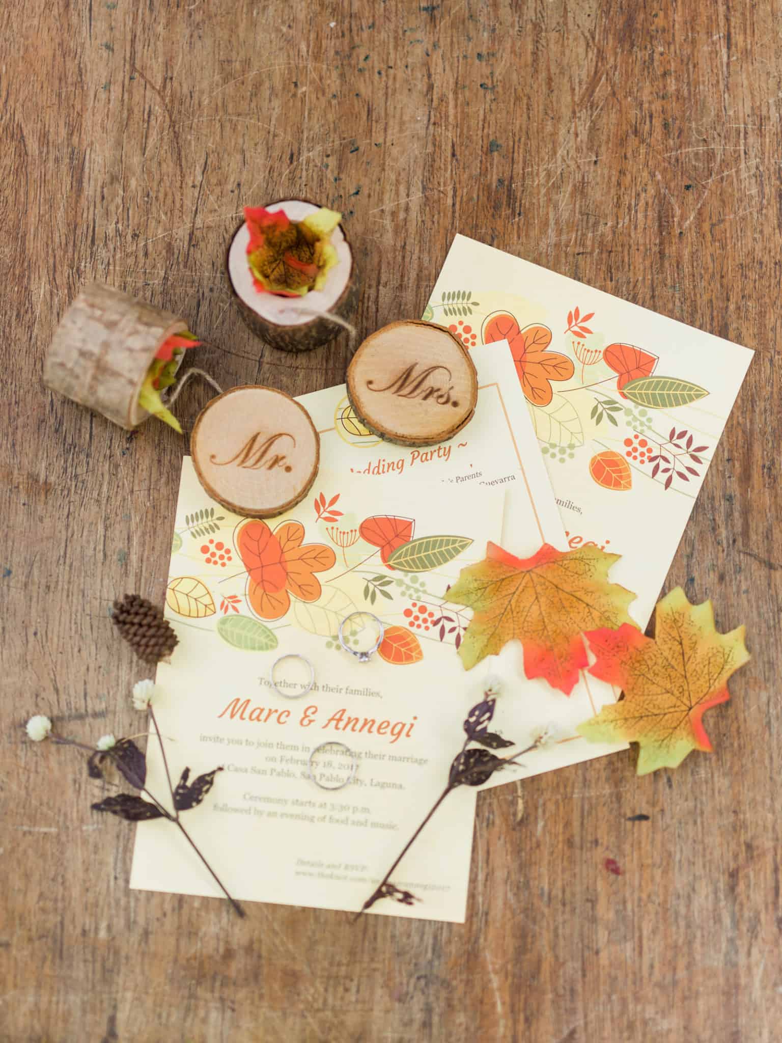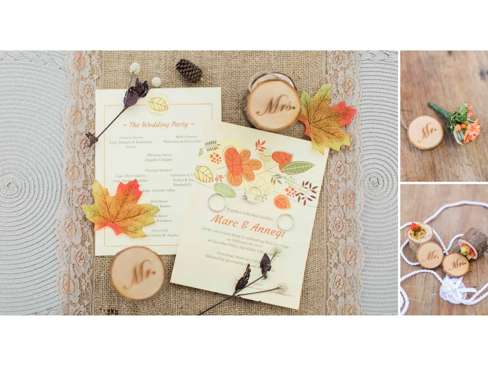 Marc and Annegi made sure that this autumn-inspired wedding was an intimate celebration with their close friends and family. Simplicity was key. They had a small entourage composed mainly of principal and secondary sponsors. Even the dress code didn’t require anyone to get into formal wear but to simply dress up using the colors of the autumn season.