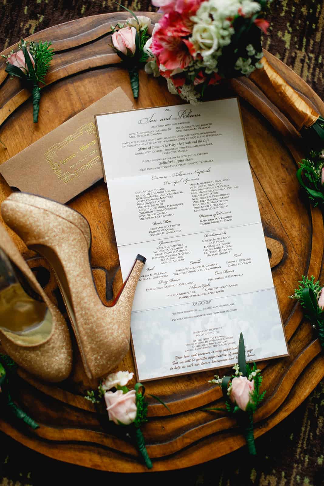 Suppier Spotlight: Photography: Team Benitez Photography | Videography: Christian Andaya Films | Bridal Gown: Adrian Sahagun Bridal |Bridal Robe: La Tercera | Entourage Gowns: Thalia Javier | Hair & Makeup: Jahjah Cimafranca & Kimmy Villaflor | Flowers: Dangwa Florist | Emcees: Eugene Lee and Hazel Aguilon of RX 93.1 | Church – Shrine of Jesus | Reception Venue: Sofitel