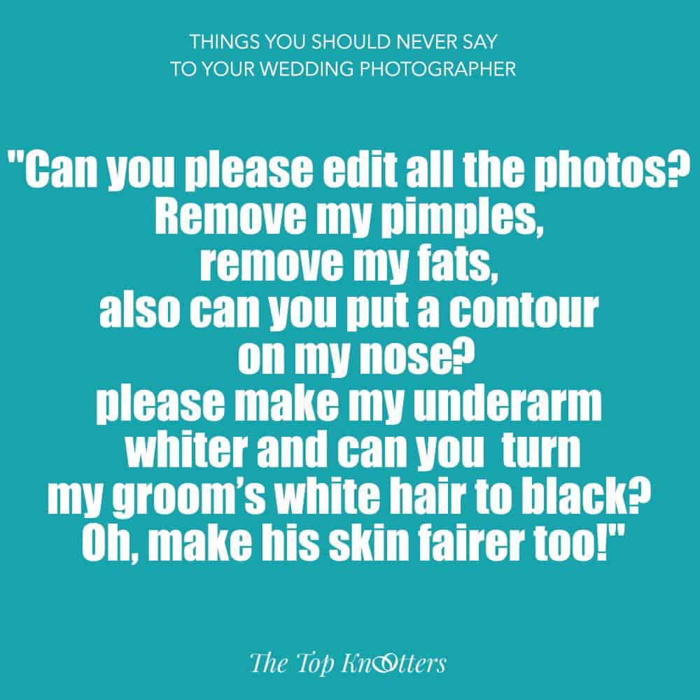 I saw a set of memes similar to this one. 🙂 Well I suppose experienced wedding photographers are used to these by now and I hope they wouldn’t take it personally. A lot of people really don’t know much about photography but think they do because it’s so easy to buy a camera nowadays. It’s just the way it is. Good reminders, still.